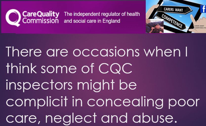 Care Quality Commission are often informed of incidents involving poor care, neglect and abuse, yet frequently don’t take action to prevent it from happening, thereby allowing it to continue. Could a CQC inspector sometimes be complicit in concealing it? I think THEY should face consequences and replaced with a new, fit for purpose, regulated organisation.