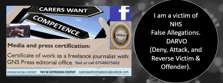 Carers Want Competence: Your Public Watchdog for Accountability in Care As a GNS Press Accredited Citizen/Public Interest Journalist (engaging in journalist activities) and independent public watchdog, Carers Want Competence is dedicated to rigorously scrutinising, investigating, and exposing extreme and systemic institutional failures, poor practice, and serious misconduct within all areas requiring duty of care and accountability, including health, social care, mental health, domiciliary, residential, and nursing care across the UK and internationally. My activities involve comprehensive research, including investigating publicly available information on the conduct of individuals and institutions involved, to inform these exposures. I also engage in investigative work and am sometimes contacted by mainstream media investigative journalists. We believe heightened public awareness and engagement are crucial to fighting these abuses, restoring dignity, and ensuring an acceptable standard and quality of care for vulnerable individuals, service users, residents, and their families. Our work directly parallels efforts like the recent success of Rashid Abbasi case, underscoring the vital public interest in naming individuals complicit in serious failings to achieve accountability. Our mission is to foster transparency and secure accountability where it's desperately needed. We highlight: Corporate abuses of power and organizational toxic cultures that disregard individual rights and duty of care. The widespread problem of neglect and abuse often disregarded or concealed, denying individuals and families justice. Fabricated allegations and reverse-blame tactics used by professionals and management to silence whistleblowers and advocates who seek to expose wrongdoing. Protecting Future Lives: We cannot stress enough the importance of advocating for the rights, safety, and protection of future patients and their families. Our efforts aim to deter poor provision of care and lead to more impactful results for the entire community. Support Services: Beyond raising awareness and exposure of poor practises, we offer a completely free service of advice, referrals, emotional and practical support (including face-to-face assistance), mediation, and representation. With over twenty years of experience as a complex needs family carer and a background as a Support Coordinator in the care sector, I provide informed advocacy and support. We also collaborate with whistleblowing organizations to ensure anonymity for care professionals who wish to report concerns in confidence. Member of: National Association of Care and Support Workers, Care Home Professional, and GNS Press. Contact us: carerswantcompetence@gmail.com or 07548075602. Content Disclaimer: Please note that content shared on this page may contain graphic and disturbing details due to the nature of the issues we report on View all posts by Carers Want Competence