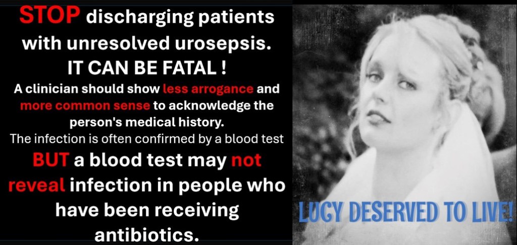 I was NEVER ‘aggressive, I NEVER raised my voice or ‘demanded’. I simply voiced my opinion that clinicians should acknowledge in particular Lucy’s evidenced medical history, and how often they had made the wrong decisions, which typically were proven to have put my wife’s life at severe risk. Lucy’s symptoms were in line with sepsis guidelines and urine cultures have NEVER failed to spot urosepsis, whereas blood tests usually have failed.
