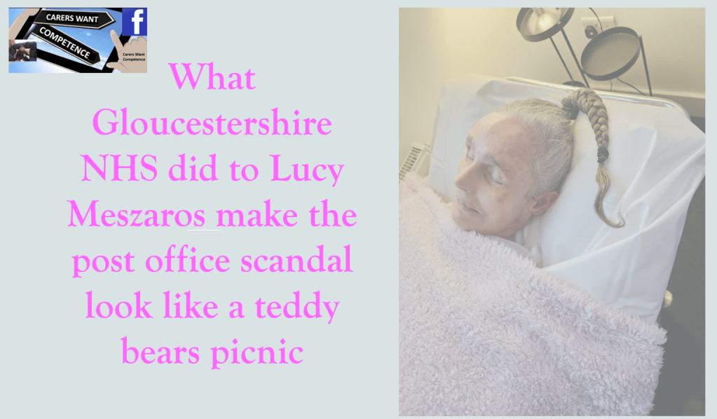 This case arises from an eight-year dispute with Gloucestershire hospitals over gaslighted concerns and reverse-blame false allegations following my complaints through correct channels, evidenced recordings of poor care & treatment, neglect, covert DNACPR’s, covert Deprivation of Liberty and ReSPECT authorisations, frequent hospital unsafe and failed discharges of my wife Lucy throughout no less than thirty-five times extremely life-threatening urosepsis infections.